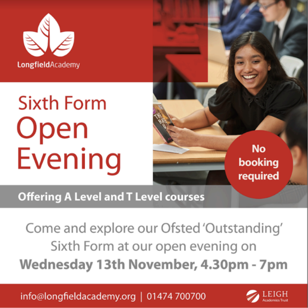 We are excited to welcome you to our Sixth Form Open Evening on Wednesday 13th November 4:30pm – 7:00pm, to showcase the wide variety of Level 3 courses we offer at Leigh Academy Longfield. These include a range of A Level, T Level and Applied General courses. We will also have talks on the provision in the Sixth Form, the enrichment opportunities available to our students and further information on the application process.
